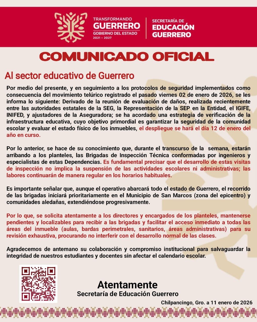 La Secretaría de Educación Guerrero (SEG) anunció que, a partir de este lunes 12 de enero, comenzará el despliegue de brigadas de inspección técnica para evaluar el estado físico de la infraestructura educativa en la entidad, como medida de seguimiento al sismo registrado el pasado 2 de enero.