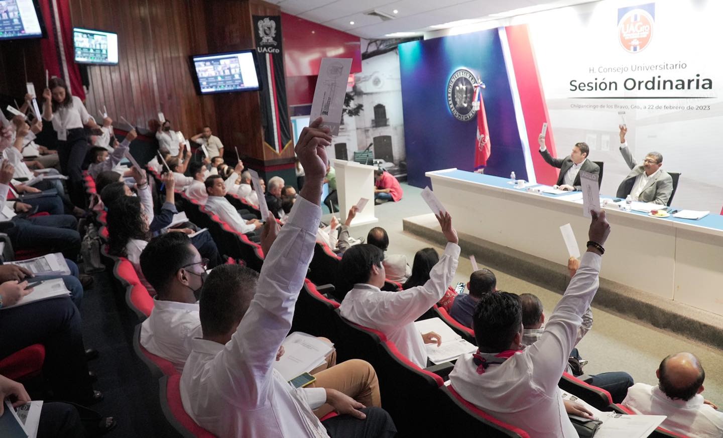 Con la asistencia de 166 consejeros universitarios, en una sesión híbrida, por primera vez después de la pandemia por el Covid-19, se reunieron de manera presencial en el Auditorio de Rectoría 146 consejeros universitarios mientras que el resto lo hizo de modo virtual.