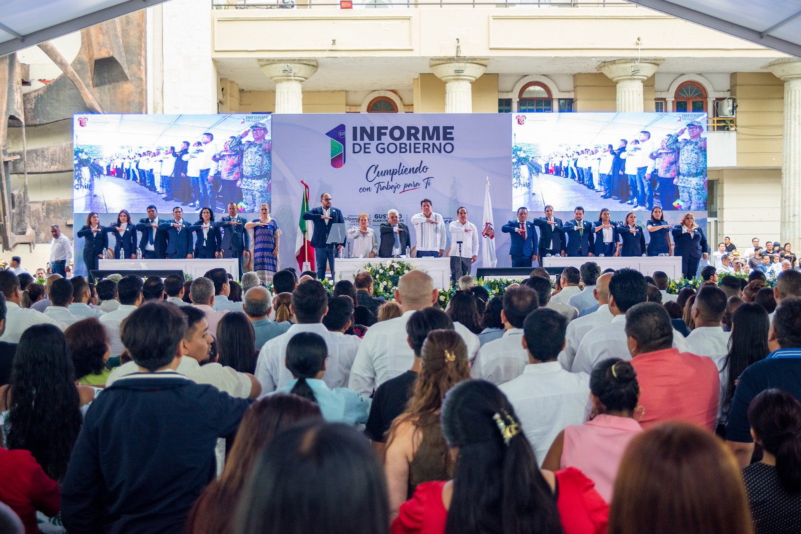 Chilpancingo, Guerrero.– En un Zócalo abarrotado por más miles de habitantes que llegaron desde colonias, comunidades y localidades del municipio, el presidente municipal Gustavo Alarcón rindió su Primer Informe de Gobierno, acompañado por la representante de la gobernadora Evelyn Salgado Pineda, la Dra. Anacleta López Vega, así como por personalidades políticas nacionales, estatales y municipales.