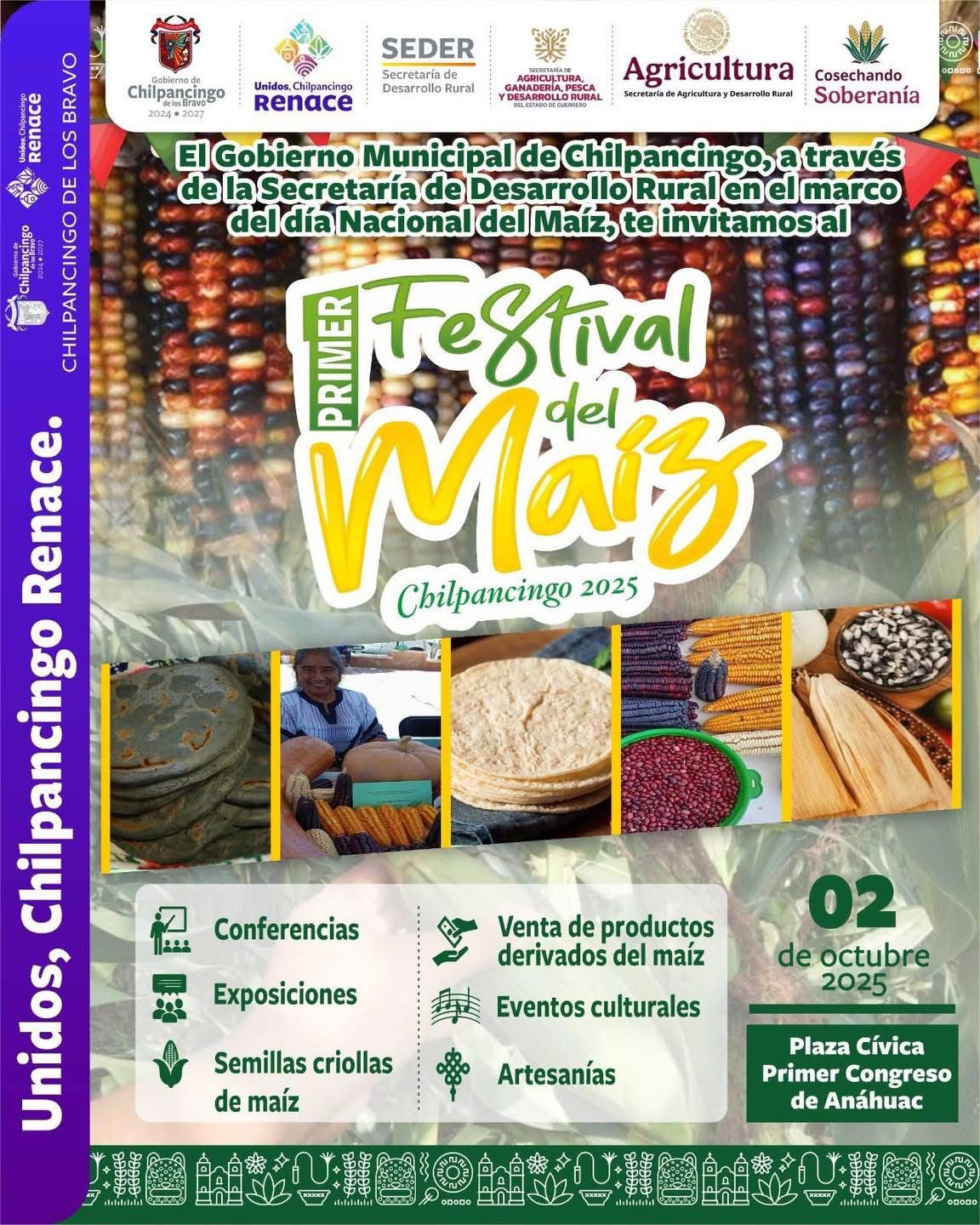 Chilpancingo de los Bravo, Gro., a 1 de octubre de 2025. – El Gobierno Municipal de Chilpancingo, que encabeza el presidente municipal Dr. Gustavo Alarcón Herrera, a través de la Secretaría de Desarrollo Rural, invita a la ciudadanía al Primer Festival del Maíz Chilpancingo 2025, que se llevará a cabo en el marco del Día Nacional del Maíz.