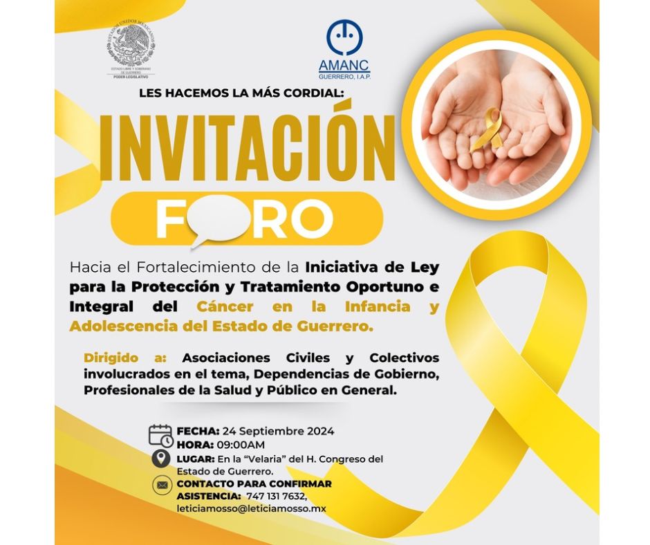 La diputada Leticia Mosso Hernández invita a las asociaciones civiles, colectivos, dependencias de gobierno, profesionales de la salud y al público en general a participar en el Foro para el Fortalecimiento de la Iniciativa de Ley para la Protección y Tratamiento Oportuno e Integral del Cáncer en la Infancia y en la Adolescencia del Estado de Guerrero.