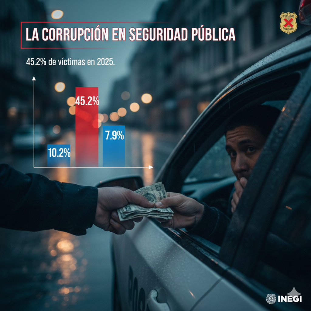 Durante el primer semestre de 2025, el 45.2% de las personas de 18 años o más residentes de áreas urbanas que tuvieron contacto con autoridades de seguridad pública fueron víctimas de corrupción, de acuerdo con datos de la Encuesta Nacional de Seguridad Pública Urbana (ENSU) del INEGI.