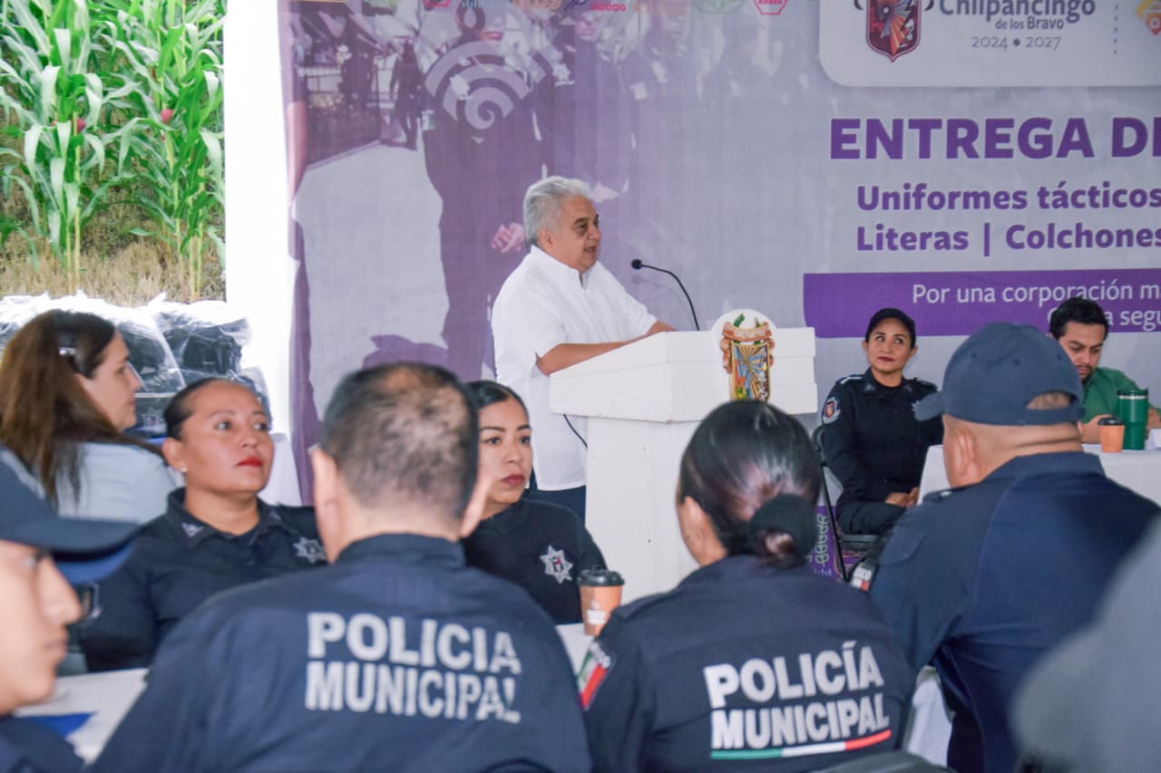 El alcalde de Chilpancingo, Gustavo Alarcón Herrera, entregó uniformes tácticos, equipos de radiocomunicación, literas, colchones, lockers e impermeables a elementos de la Policía Preventiva Municipal con el objetivo de dignificar y fortalecer sus condiciones laborales.