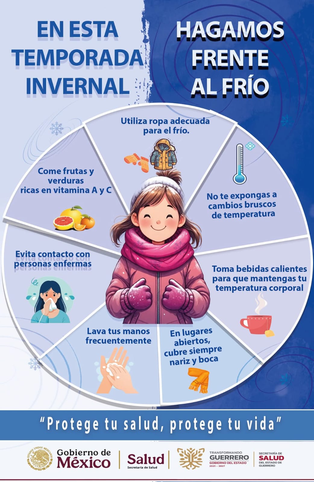 La Secretaría de Salud Guerrero (SSG) exhorta a la población a reforzar las medidas de prevención para evitar enfermedades respiratorias propias de la temporada invernal, poniendo especial atención en niñas, niños, personas adultas mayores y quienes padecen comorbilidades.